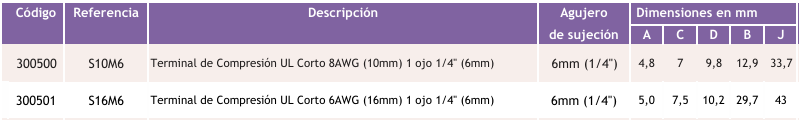 | tamaño | Terminal de Compresión UL Corto 8AWG, Terminal de Compresión UL Corto 6AWG |
